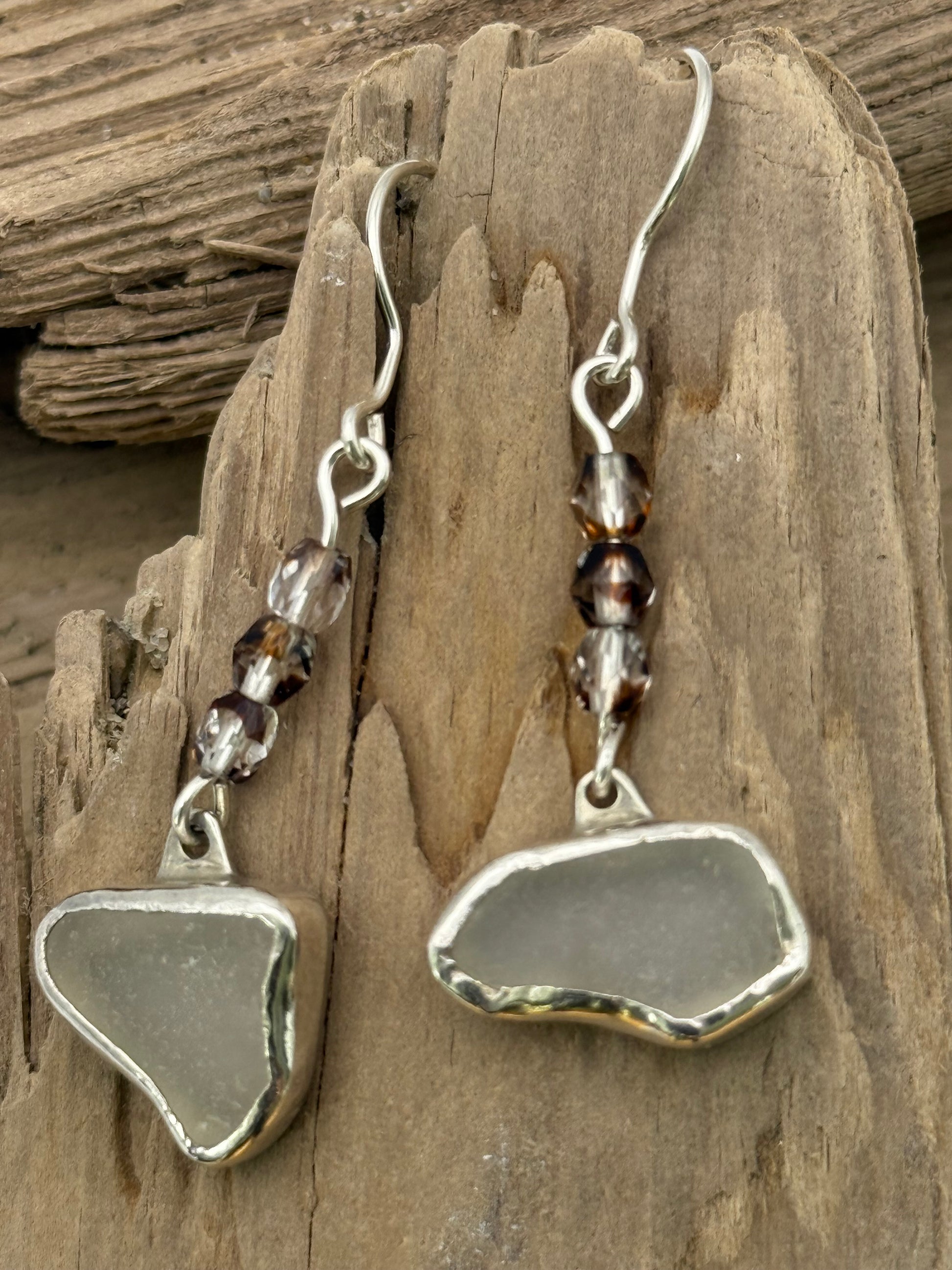 Hand crafted pair of white Sea glass earrings set in sterling silver with natural stone beads and sterling silver ear wires.