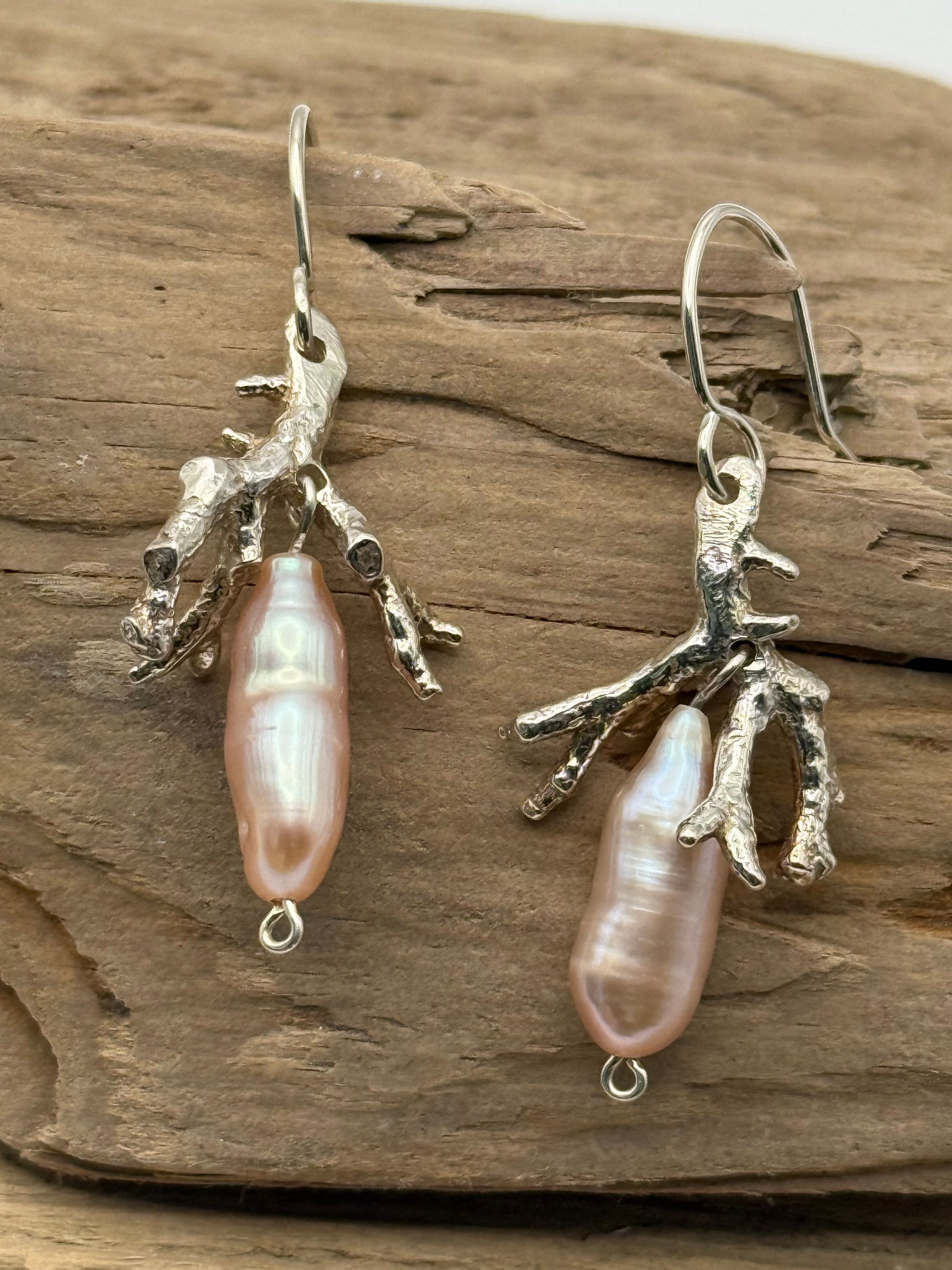 Hand crafted pair of sterling silver cast branch corral and pink pearl earrings with sterling silver ear wires.