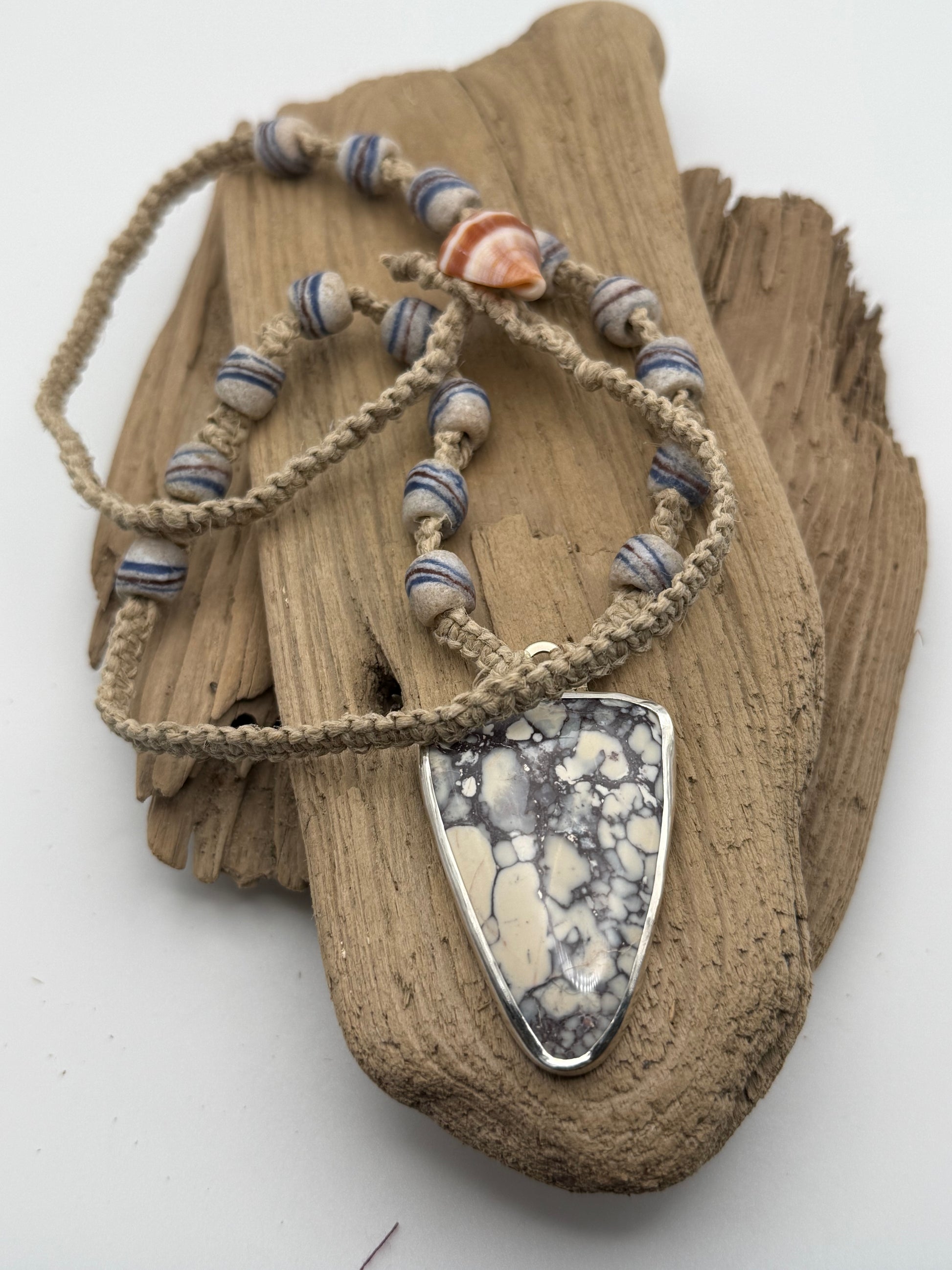 Hand crafted Viper Jasper pendant. Strung on hemp macrame with African glass beads and a seashell. Macrame necklace is 24” in length. The Viper Jasper is fine silver bezel set on nickel silver. Piece is 1 1/4” x 2 1/8” in size.